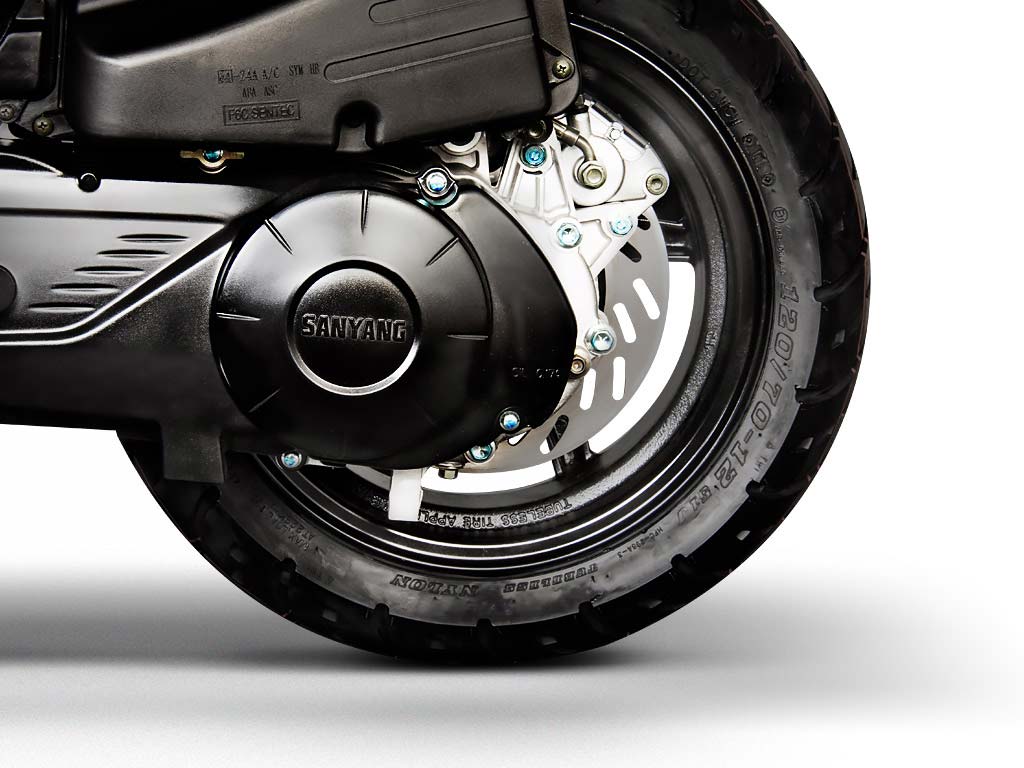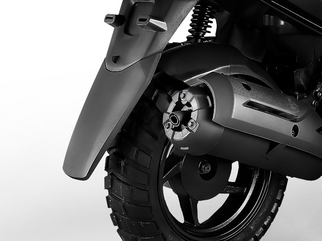 | Rear Brakes Disc (220 mm) with CBS-Combined Braking System | Front Tires 120/70 - 12 Knobby Tire | Rear Tires 130/70 - 12 Knobby Tire | Wheel Aluminum |
