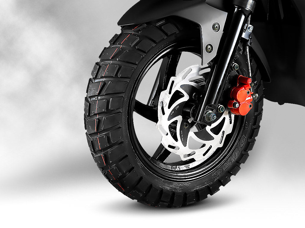 Get extra respect and make a statement on the road with upgraded knobby tires. The enhanced front sporty wave disc rotor brakes will have everyone following your lead.